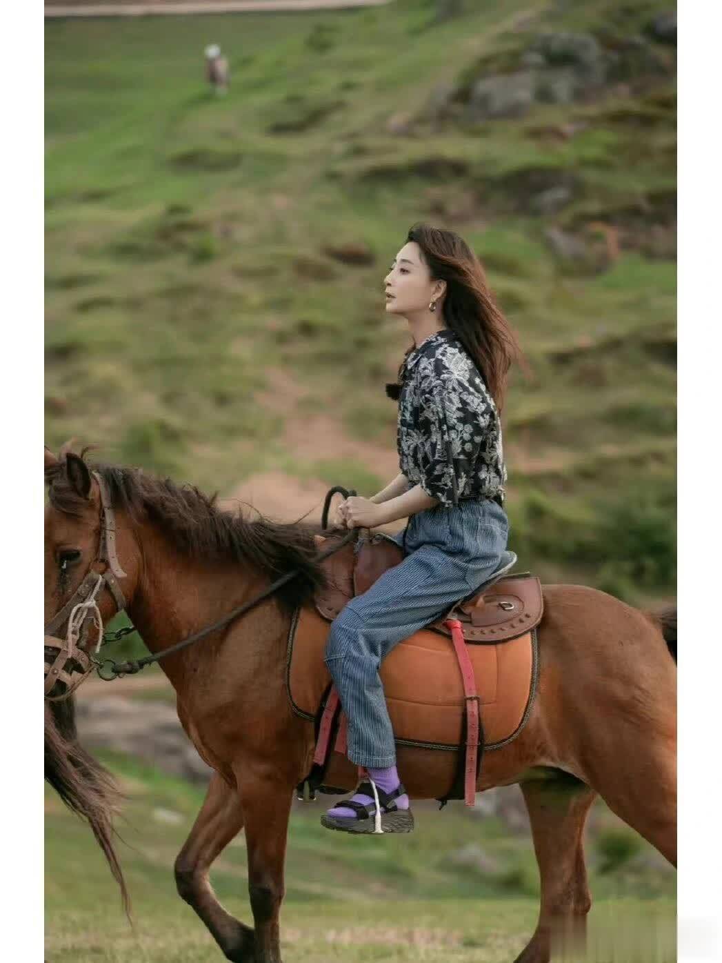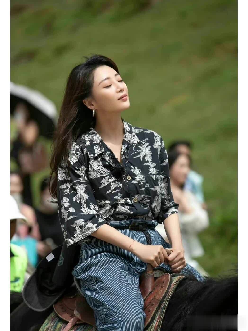 再看殷桃的这身搭配,上半身她选择了一件黑底白花的复古印花衬衫,印花是细碎的植物纹样,黑白色的花纹低调却不沉闷,保留了春日的灵动,还不会显得花哨甜腻。她将衬衫下摆半塞在裤腰里,可以悄悄拉高腰线,让整体比例更舒展,还能藏住小肚腩,对中年女性非常友好,微胖小个子都可以借鉴。