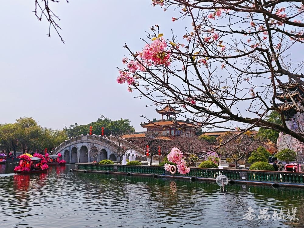 宝墨园经营部经理辛敏贤表示,园内核心种植中国红、广州樱两大本土自主培育樱花品种,结合往年开花情况,本次樱花节整体赏樱期将持续至4月上旬。其中“中国红”花期较早,目前已率先绽放,嫣红的花簇缀满枝头,成为春日里一抹亮眼的景致;而作为本次樱花节主角的“广州樱”,预计下周将进入盛花期。辛敏贤介绍,今年樱花节围绕“踏雪寻樱赴春宴”主题,创新打造“人工飘雪+浪漫樱花”的沉浸式实景舞台,同时叠加影视化场景布置,打造多款古装剧集氛围打卡点,3月14日至15日、21日至22日、28日至29日还将推出沉浸式短剧互动,游客可与古风NPC近距离互动、合影留念,全方位提升游园体验。此外,艺林苑牌坊前的汉风市集也将同步开放,樱花特调饮品、文创雪糕、樱花主题周边等多元业态齐聚,打造“可赏、可品、可购、可体验”的消费新场景,让市民游客在岭南古韵中尽享一场光影与樱花交织的春日之旅。
