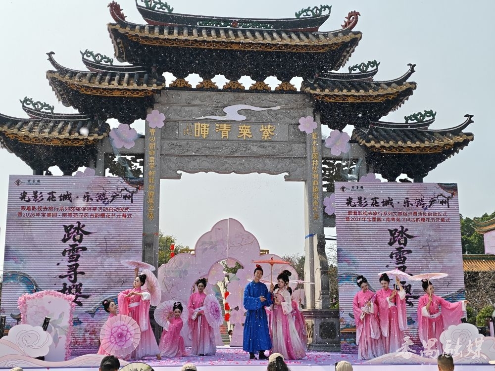 三月春风送暖按天配资利息,樱花初绽枝头,番禺宝墨园迎来了一年一度的赏樱佳期。3月8日上午,“光影花城・乐游广州” 跟着影视去旅行系列文旅促消费活动启动仪式暨2026年宝墨园・南粤苑汉风古韵樱花节开幕式在宝墨园启幕。本次活动以“踏雪寻樱赴春宴”为主题,将汉风古韵的雅致、樱雪漫舞的浪漫与影视IP的趣味深度融合,不仅为游客带来了一场沉浸式的文化视听盛宴,更开启了广州“影视内容赋能+文旅消费促进”的全新合作模式,为大湾区文旅产业发展注入新活力。